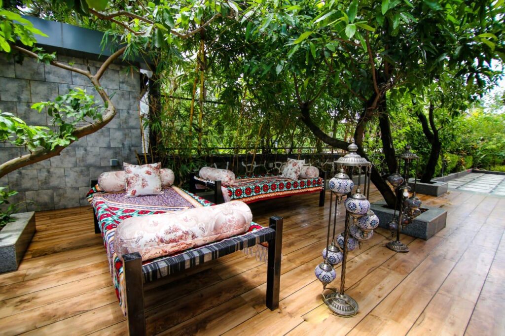 7.⁠ ⁠Comfortable outdoor seating with two Charpais and ambient lighting.